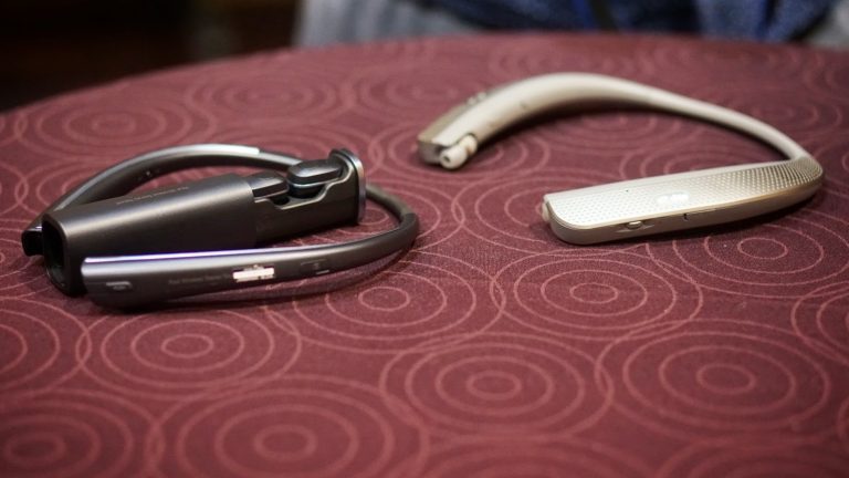 The Tone Studio take the LG neckband and make it a bluetooth speaker. The Tone Studio headset has 4 speakers, 2 on the top and 2 on the bottom. It also has the traditional earbuds at the tip of the neckband. There’s a toggle button to switch from using the earbuds to using the speakers. The speakers are supposed to feel liek you have surround sound technology. The bass isn’t too strong on them, but the speakers are loud. You can feel the music vibrate around your neck. The build quality seems good too. When we asked LG about using the Tone Studio for fitness related activity, they said it’s not sweatproof and don’t recommend for the gym. They are more lifestyle related.