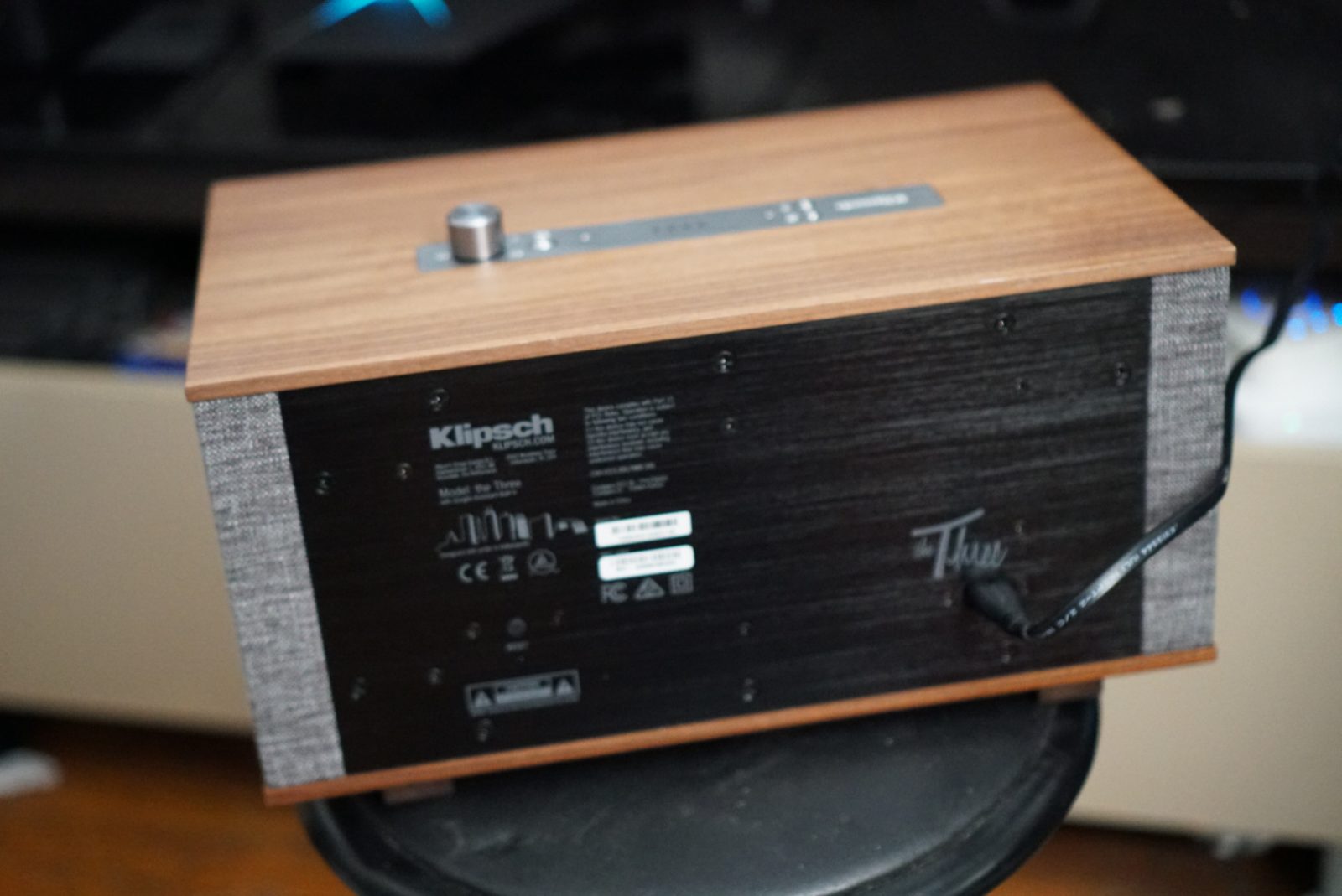 This speaker has a very long name, the Klipsch The Three Speaker with Google Assistant. It’s a new version of Klipsch The Three Speaker with a few changes. For reference, here are the major differences. While they look similar on the front and sides, you’ll notice the buttons and ports are very different. The original The Three Speaker has almost every port you can think of. It has 3.5mm, RCA analog, Bluetooth, Wifi (for DTS playback), and USB 2.0. The Three With Google Assistant doesn’t have any inputs. You have your usual smart speaker button setup, the mic on/off button, volume knob, and Bluetooth button.