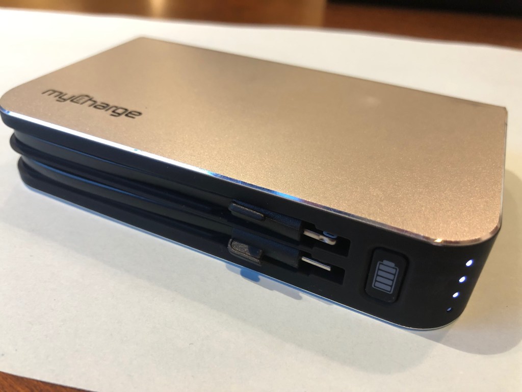 The myCharge HubMax is a beast of a portable charger, weighing in at a bit over one pound with a 10,060mAh capacity. I appreciate how the myCharge team really thought this product through, adding an appropriate amount of common sense and surprising features. For one, it comes with an integrated Lighting cable, an integrated micro-USB cable and a built-in USB port; all of which allows you to charge iPhones, Androids, and other mobile devices like tablets. Since it’s all built in, you don’t need to carry any cables on you and allows you to charge two devices at once. There’s even a user-friendly button with a battery icon on it that you can press to activate the LEDs that indicate the amount of charge left in the HubMax.