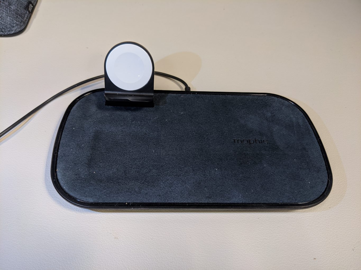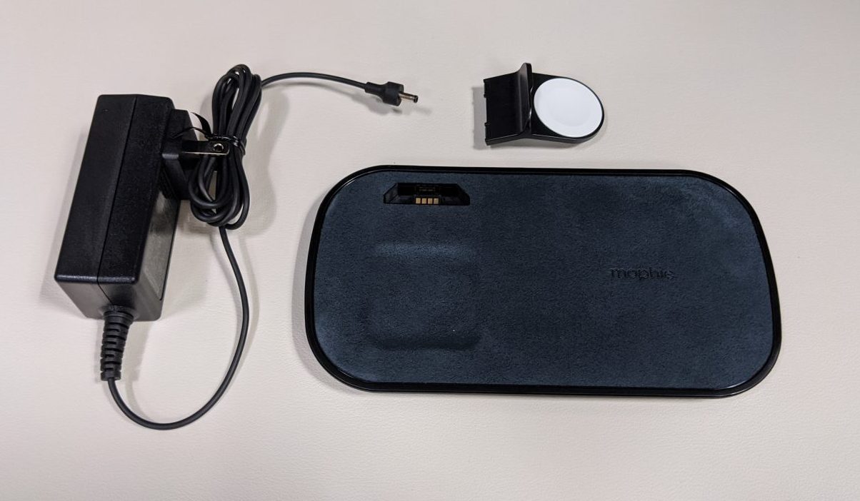 The mophie 3-in-1 wireless charging pad looks like your usual charging mats with rounded corners. There are two versions of the charging pad. I got the fabric version (there’s a glass mat version). The mat has a port to attach the dongle to charge the Apple Watch. The dongle goes in firmly and stays sturdy. No wiggle room. You don’t need to use your apple watch charger cable for the mat. The watch charging stand works with the mat. The part of the mat that’s in front of the apple watch charger, has an indented space created for the Apple AirPods.