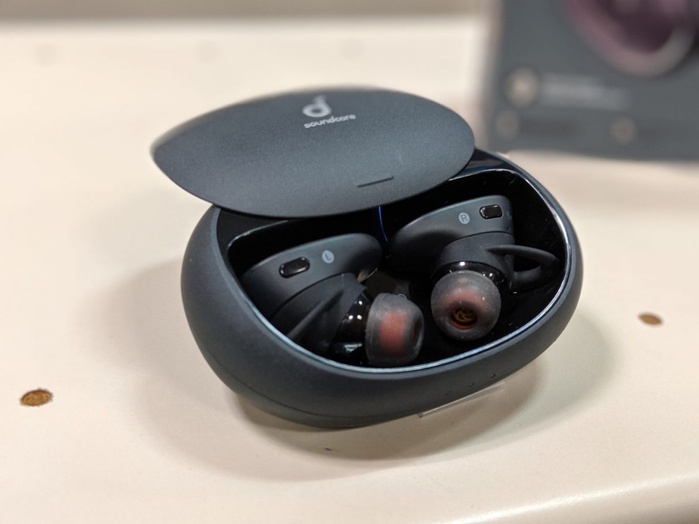 The outside of the earbuds are oval-shaped and have ear wings on the top that allow you to lock the earbuds into place. The Liberty 2 Pro don’t have stems or tips that hang outside of the ear. The top of the earbud has a button (each earbud has one).