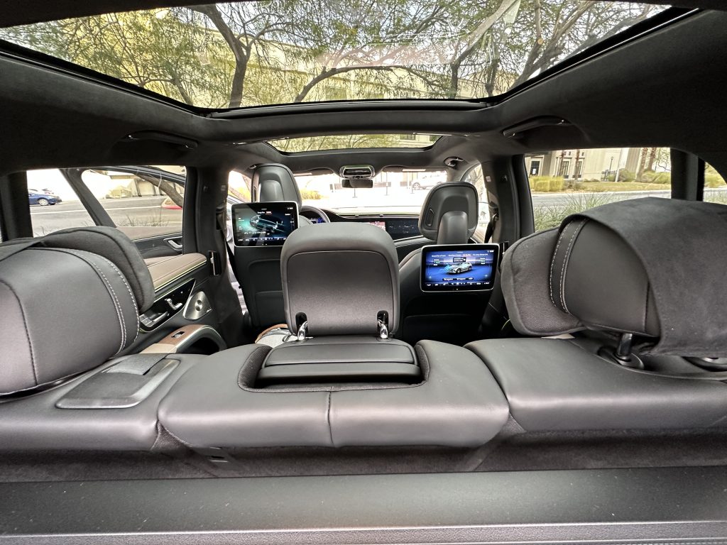 It’s a Mercedes, so it almost goes without saying the car has a luxurious look and feel inside and out. We started with the top-of-the-line Mercedes-AMG EQS Sedan. I am someone who enjoys bells and whistles. Give me all the tech and luxury! A good gimmick is great when it’s not only gimmicky but useful. We also drove the EQS SUV. A lot of similarities between the main features offered. Of course, different builds get you more features, and the battery and power of the SUV are different from the sedan.