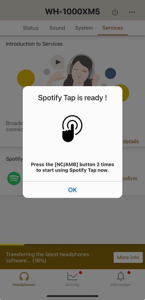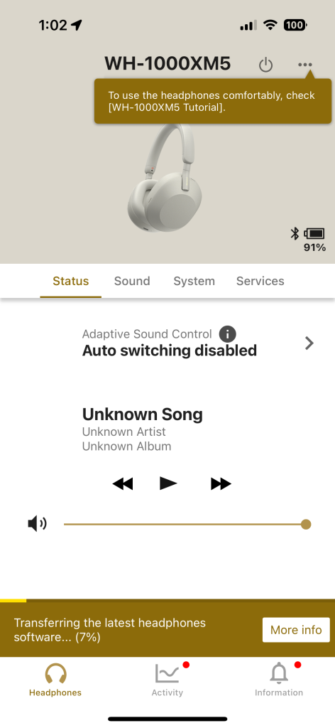 The music turns on and off as you place and remove the headphones from your head. There were a couple of times when, on a long flight, the headphones would turn off on their own even as music was still playing. Not sure what happened there. But I toggled the app never to turn off, and it hasn’t happened since. You control the XM5s with expected gestures like “Quick Attention” where you cup the entire earcup to pause the music, swiping up and down to control volume, and back and forth to control tracks.