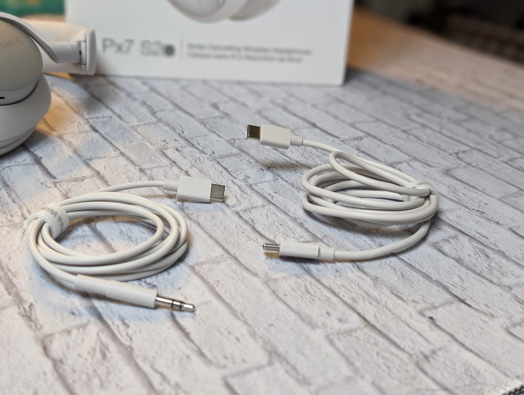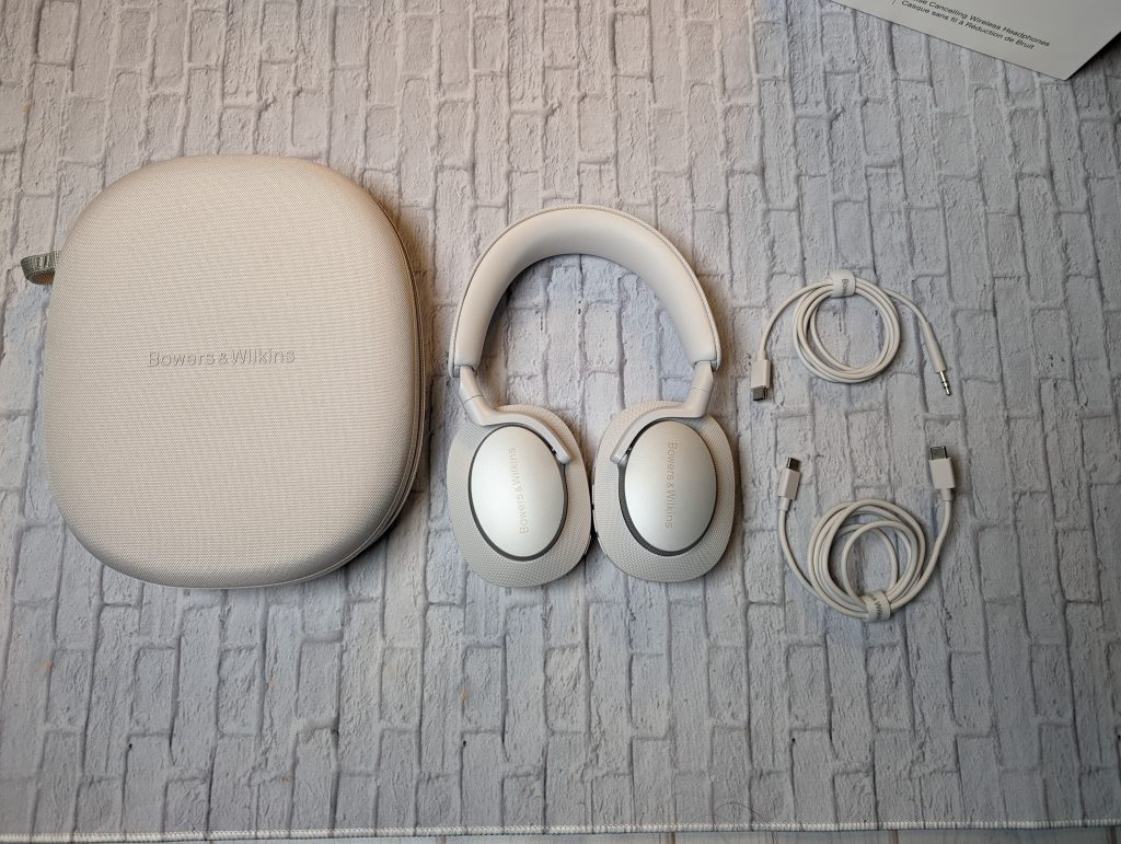 As expected, the Px7 S2e headphones are clean. We are reviewing the Cloud Grey versions, but they are also available in Anthracite Black, Forest Green, and Ocean Blue. They have a premium feel with soft leather memory foam cushions, which are pretty comfortable with earrings and glasses. The top of the headband is wrapped in fabric, while the inner part is a tighter leather. The aluminum metal plates outside of the earpads have the Bowers & Wilkins logo engraved. These have physical buttons for volume, playback control, and a USB-C charging port. The refined look of the Px7 S2e definitely falls in line with the Bowers and Wilkins branding. The other cup has a quick action button, which you can assign toggle noise-cancellation or activate a voice assistant. While they do turn flat, these headphones don’t fold, and while they have a clean look, I fear the fabric getting snagged on something, so I keep them in their carrying case. In the carrying case, a pocket carries two cables: a USB-C to 3.5mm jack and a USB-C to USB-C.