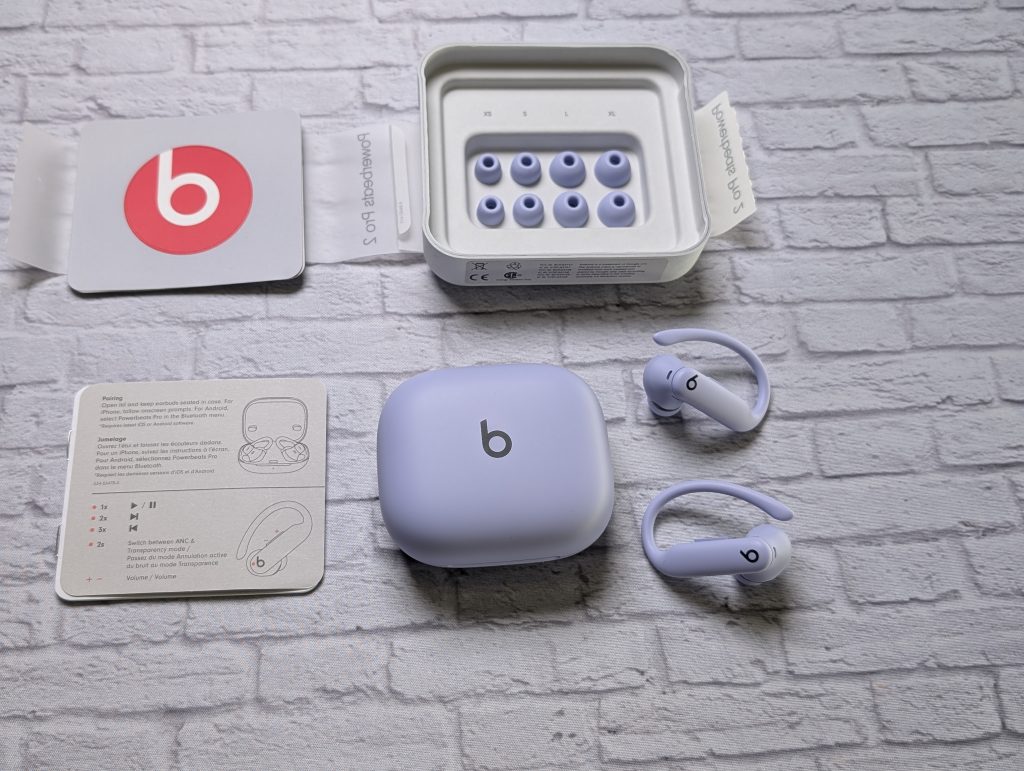The packaging is light. The Powerbeats Pro 2 come with five ear tip sizes (XS, Small, Medium, Large, and X-Large). You can do the ear fit test on the Beats app or the headphones settings on the iPhone to determine the proper fit. The earbuds’ charging case charges wirelessly (first time for Beats) or via a usb-c port located in the back. The pairing button is found inside the case between the charging slots of the earbuds. You don’t get a charging cable or wall plug in the box.