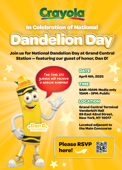WHAT: As part of the brand’s global Campaign for Creativity and iconic Limited Edition Collection launch, Crayola is hosting a celebration for National Dandelion Day to celebrate consumers and color loyalists who inspired Dan D to make his great return.