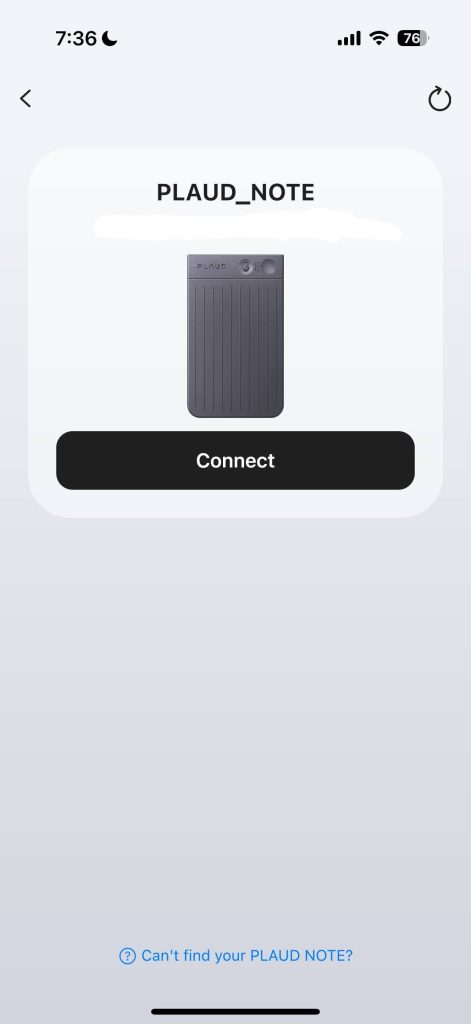 Setting it to record is pretty easy. Press the indented button and you will feel it vibrate. The red light turns on in the “a” of the “Plaud” logo at the top of the device. I love the feedback it gives, both tactile and visual. I don’t mind the double confirmation at all. You can quickly turn it on and start recording and go back to the meeting without being rude or interrupting the speakers. You pair the phone with bluetooth. After you finish recording, you would have to connect the Plaud Note to your phone to transfer the recording and create the summary.