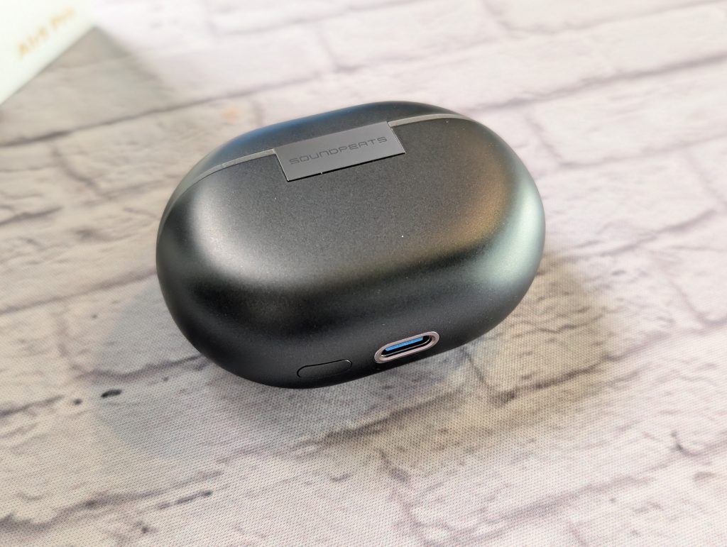 The SoundPEATS Air5 Pro earbuds have a minimal design. The small black case has a front-flipping cover to expose the earbuds. The bottom of the case has the usb-c charging port and the pair button next to it. Right above the indicator light on the case, “hear the difference” is written on the border. You can only see that when the case is open.