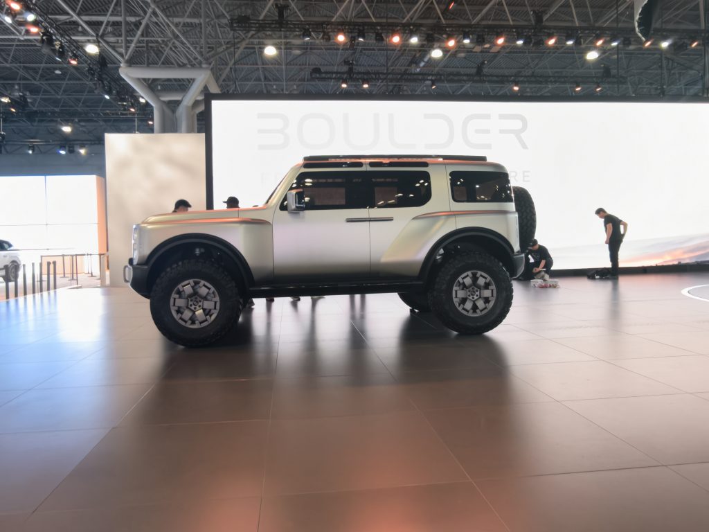 The Boulder Concept’s interior utilizes robust materials for key touchpoints, including grab bars and other high-wear areas. Frequent-use switchgear includes satisfying physical knobs and buttons within easy reach for confidence-inspiring use, even when bouncing over uneven terrain.